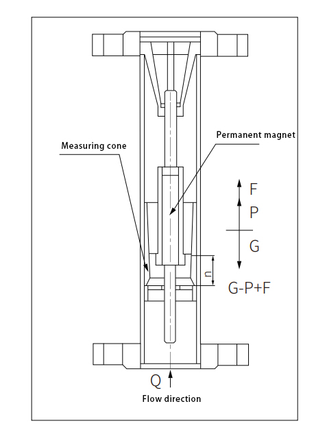 Metal tube float flowmeter mainly consists of two main components: sensor and indicator. The sensor consists of a connecting flange, a measuring cone, a float and an upper and lower guide; the indicator consists of a shell, a magnetic drive system, a dial and an electrical telemetry system. Inside the vertical conical measuring tube, there is an upward and downward movable measuring part, the float (Figure 1). When the fluid passes through the conical tube from bottom to top, the float is forced by the fluid and moves upward along the conical tube. As the fluid flow increases, the displacement of the float increases; conversely, as the fluid flow decreases, the displacement of the float decreases. In other words, the flow rate of the fluid determines the position of the float in the measuring tube and thus the size of the annular area between the float and the conical tube. When the fluid flow is maintained at a constant flow rate Q, the float is in dynamic equilibrium at position h in the conical tube, where the annular area between the float and the conical tube remains constant. The float is subjected to three forces: the gravitational force of the float G, the buoyant force of the float F, and the force of the fluid on the float P. These three forces are in equilibrium. According to the fluid dynamics of the Park's endeavour equation, the principle of force equilibrium and the law of fluid continuity, it can be calculated at this time through the annular area of the instantaneous fluid flow, so the metal tube float flowmeter is the principle of variable area measurement of flow. Figure 1 Inside the float, embedded in a high-performance permanent magnet, when the float is in the equilibrium position, the float around the formation of a uniform and stable magnetic field. On the outside of the conical tube, a magnetic sensor is installed, so that the linear displacement of the float in the measuring tube can be transmitted to the indicator through non-contact form, and after detection and processing, it is finally displayed on the indicator dial or output the corresponding standard 4-20mA current signal.