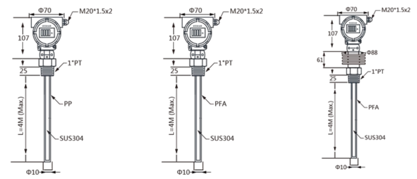 Note: High-temperature rod versions must use PFA coating (Model LFP21 series). |