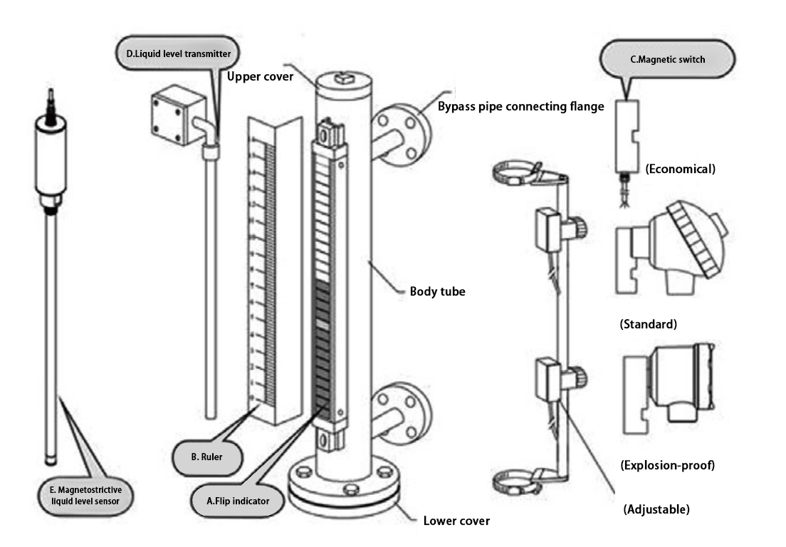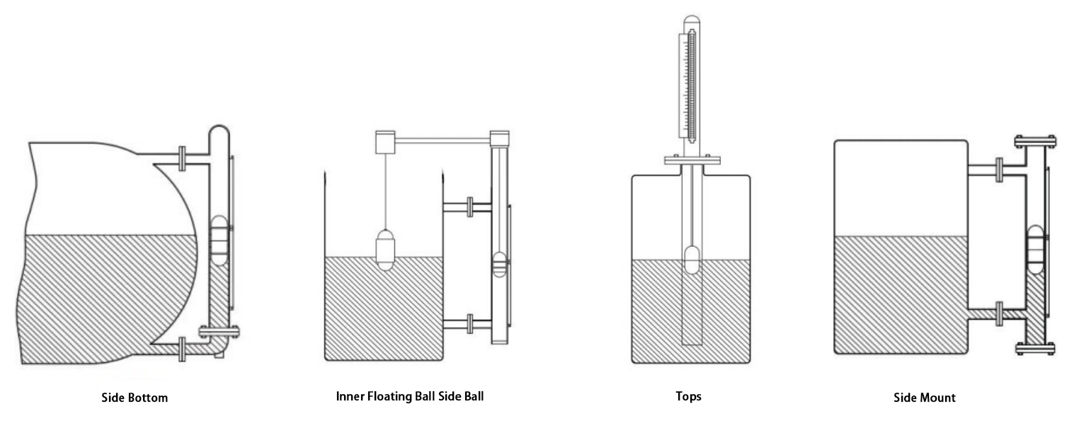 LF800 series indicators adopt either top-mounted or side-mounted bypass tube installation. The main body is equipped with a magnetic flap display, level switch, and level transmitter. The magnetic unit is either placed inside the float or linked with the float via a rod. As the float moves with the liquid level, it flips the magnetic display flaps. The level switch activates at corresponding level points, while the level sensor outputs a resistance signal influenced by the float’s magnetic field. This resistance signal is then converted by a transmitter into a 4–20 mA current signal output.