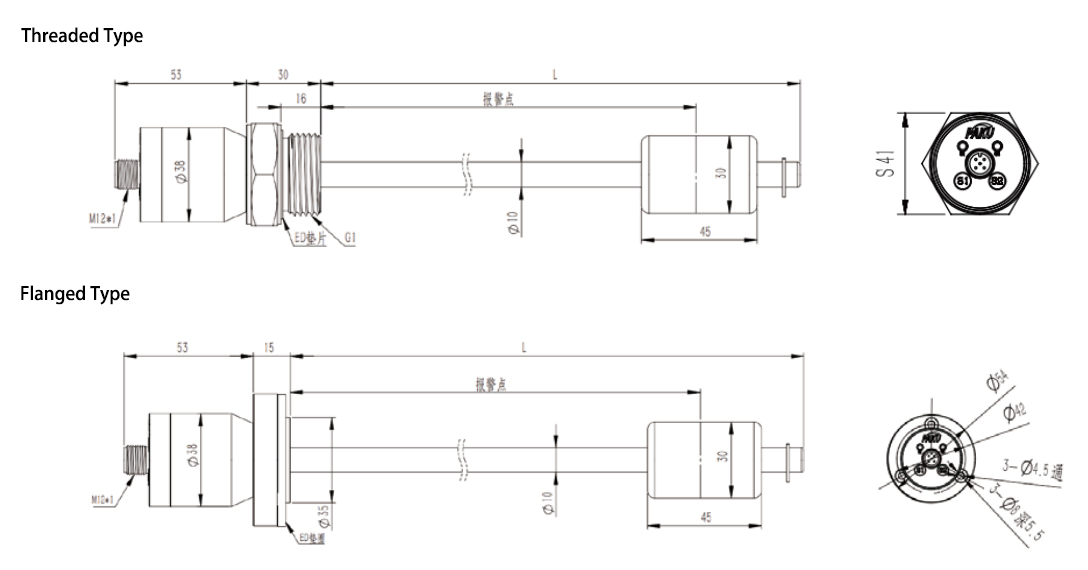 Under the buoyancy of the liquid, the float moves up and down along the guide rod, continuously triggering magnetic switches inside the rod. The magnetic switches control the number of connected or disconnected resistors, converting the liquid level change into resistance variation. The resistance value is processed by the rear circuit and then converted into a standard electrical signal output.